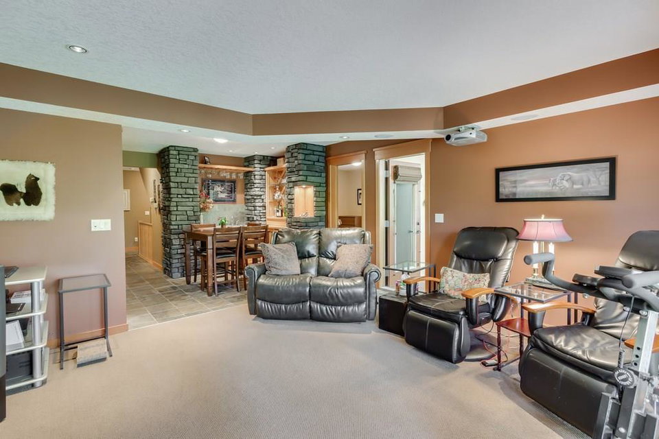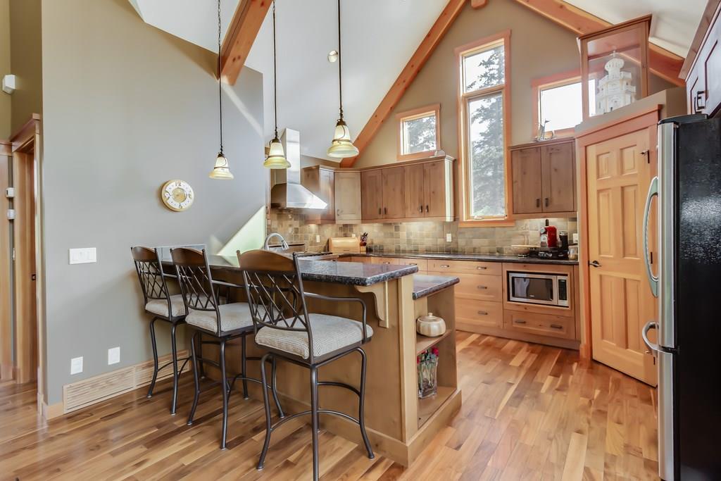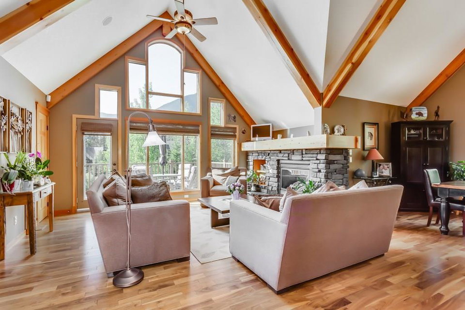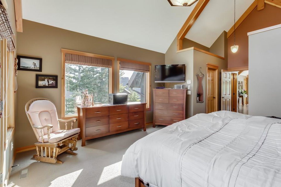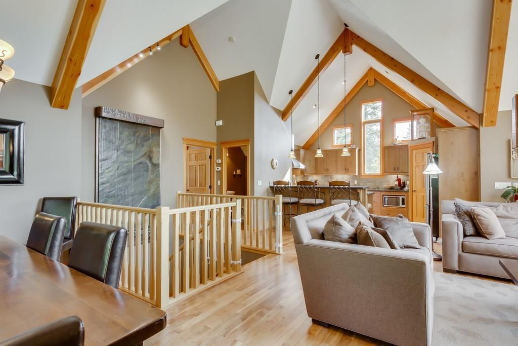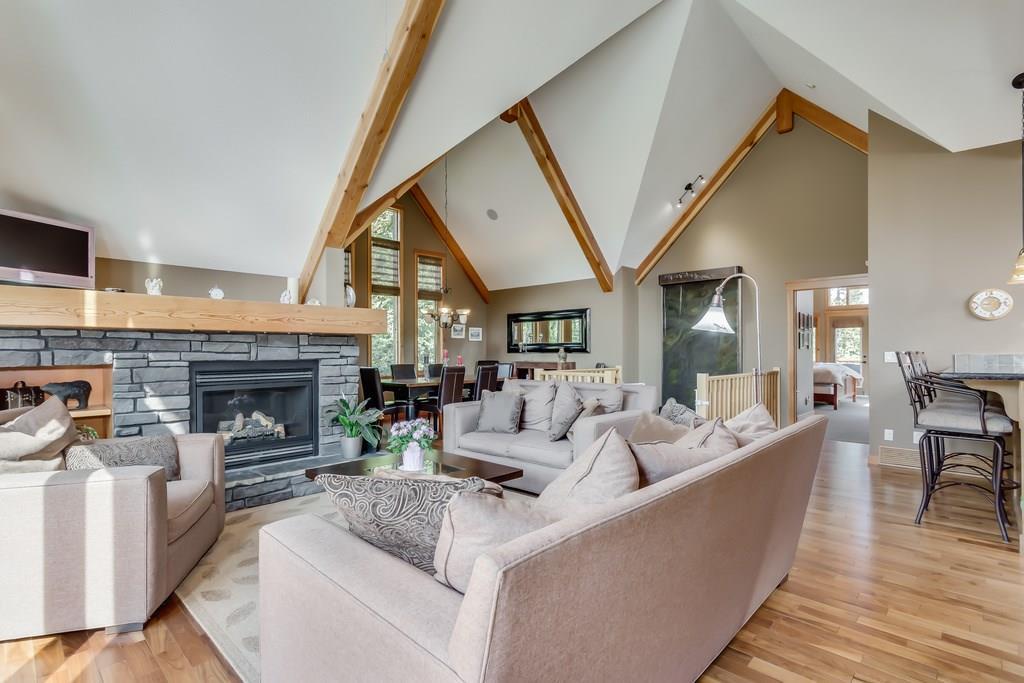 Beautifully crafted Canmore home boasting spectacular mountain views nestled in nature! Discover luxurious living throughout this 4 bedroom, 4 bathroom open concept home which features gorgeous wood work, walnut floors, vaulted ceilings with exposed post & beam accents, numerous, large windows that capture the mountain & treed views, wine room, wet bar & media room with audio visual equipment included, ample storage including a large pantry with additional cold room attached, superb outdoor spaces including 2 large decks, year round sunroom as well as a patio tucked in nature & triple car garage with workshop. This well maintained home is suite zoned & offers a legal basement suite with roughed in kitchen & separate entrance. Walk to the nearby bistro, recreation fields, playground, paths & trails in the beautiful Three Sisters neighbourhood!