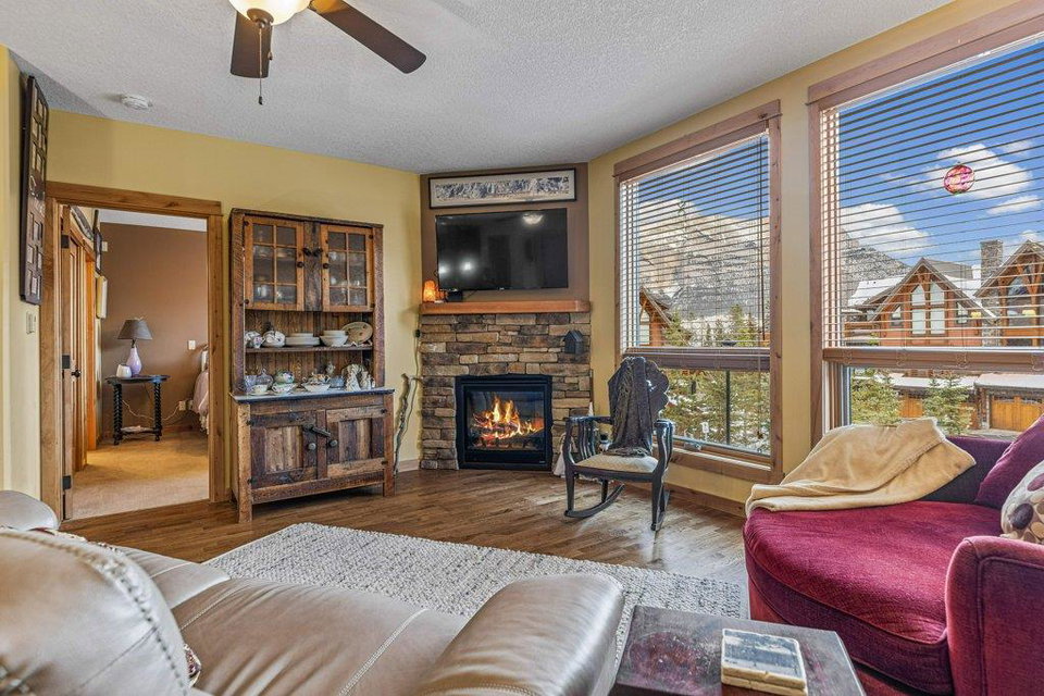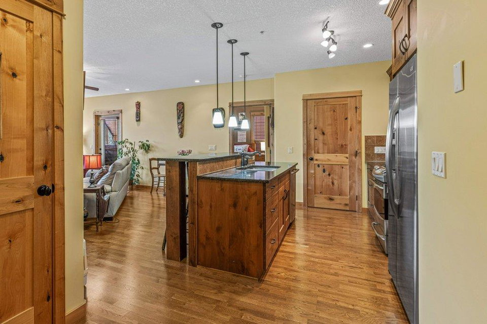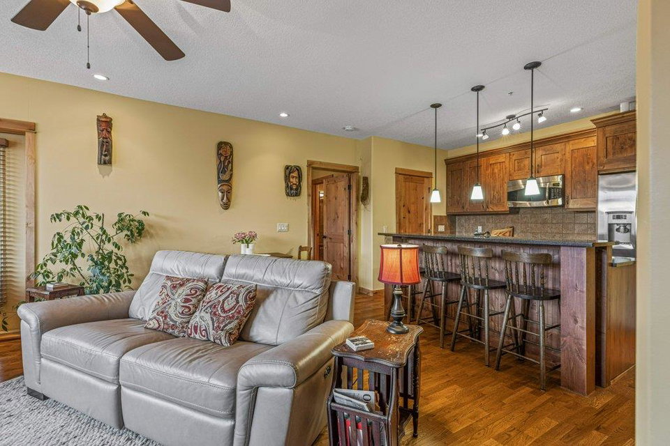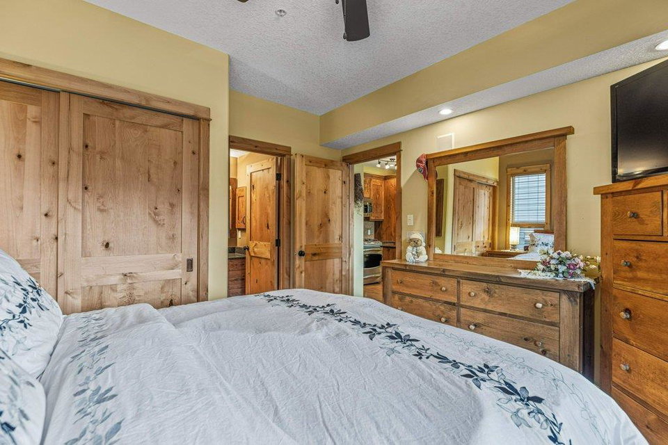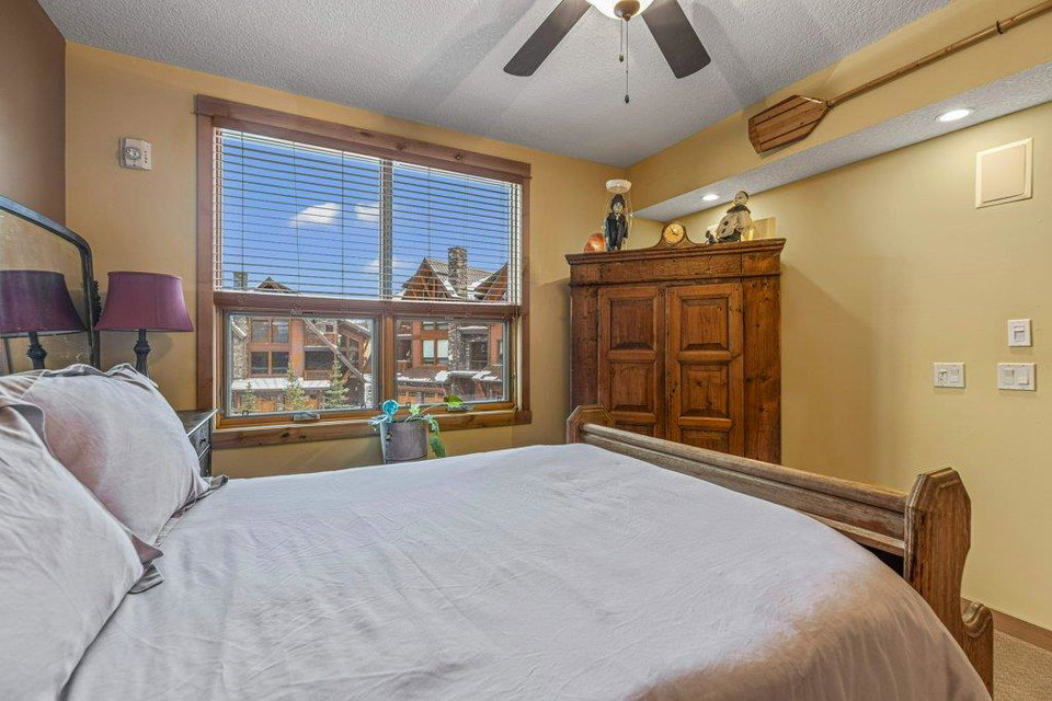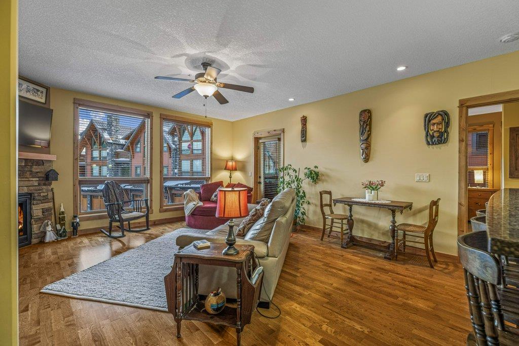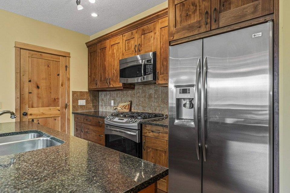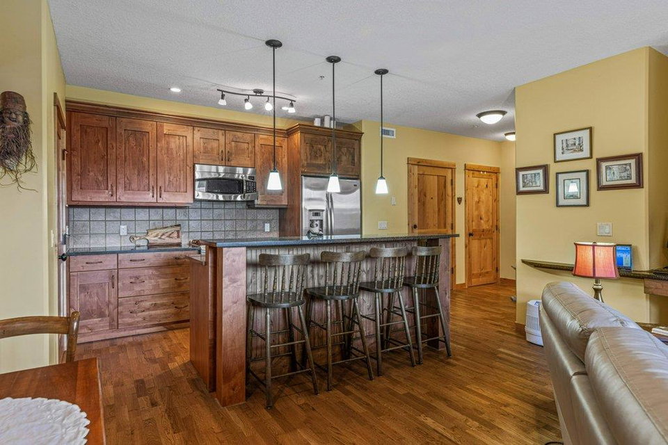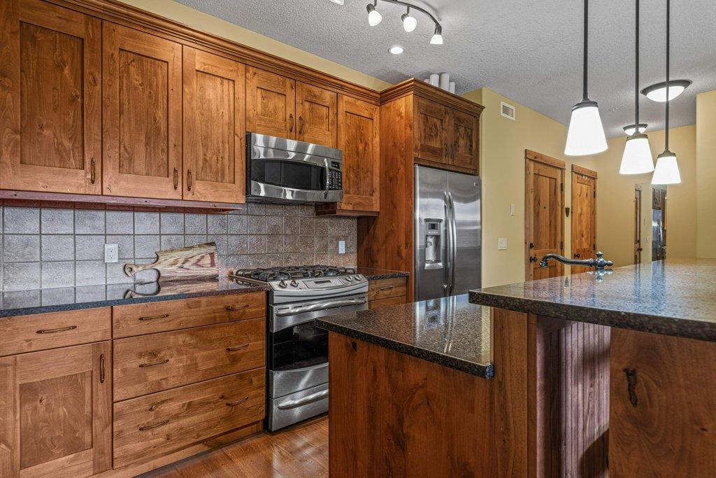 Mountain views & high quality craftsmanship reign throughout this beautiful Wilderness Ridge condominium! This luxurious 924 sq ft, 2 bedrooms, 2.5 bath condo features high end stainless steel appliances with a gas range, large kitchen island, large pantry, beautiful custom cabinetry, custom natural woodwork, granite countertops, and in floor heating throughout. A stone gas fireplace provides comfort & style to keep you toasty on those winter days. Two spacious bedrooms; both with ensuites; one with steam shower, one with soaker tub. A lovely covered deck offers a built in Napoleon gas BBQ with granite surround and a fantastic lounging area to enjoy the mountain vistas. Heated underground parking stall & storage unit included and bike storage available. Built Green Gold specifications.