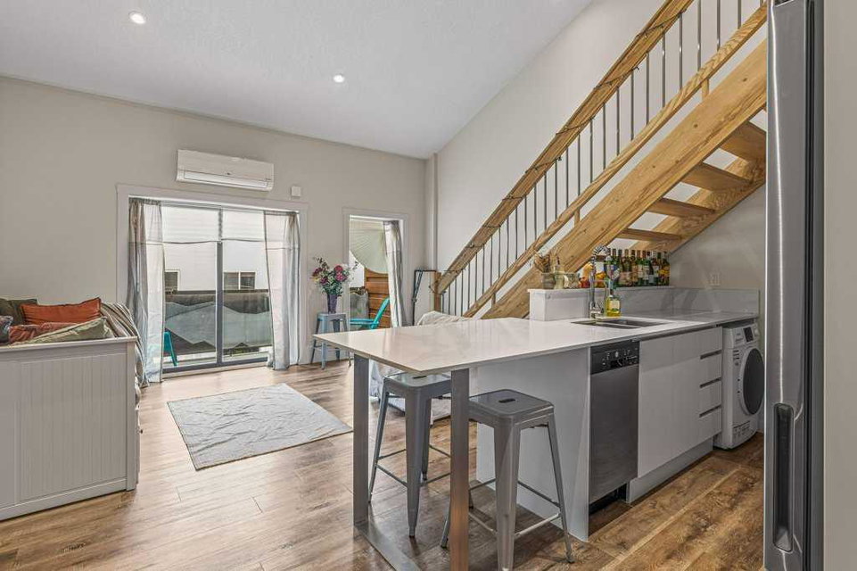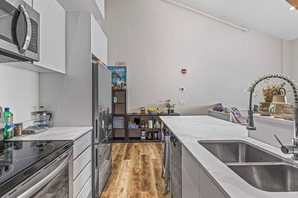 Welcome to an unique community with sustainability at its core including an electric car charging station. Walk to shops, groceries, and downtown in minutes. Nestled on the second level of iPlace, 1 bedroom, 1 bathroom loft boast 600 sq ft of contemporary living over 2 levels with access to unique amenities. Studios include bright kitchens with quartz countertops, eating bar, ss appliances & ample cabinetry, open to the spacious living area offering large windows with access to a balcony to enjoy the views. A generous, chic bathroom & in suite laundry will complete the main level. The open loft level features an oversized bedroom space with substantial storage. Shared parking & indoor bike storage & wash available. Unit is complete with indoor separate storage area. All units have individual air conditioning units. Don’t miss this opportunity to live in the heart of the iPlace community.