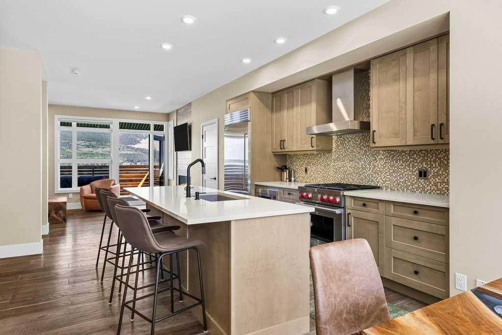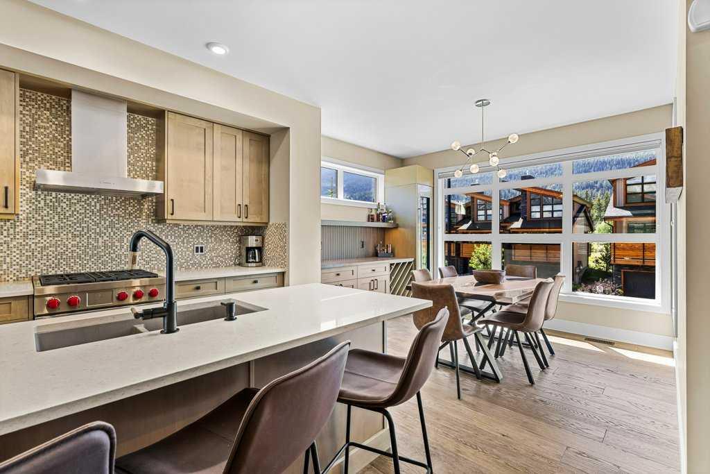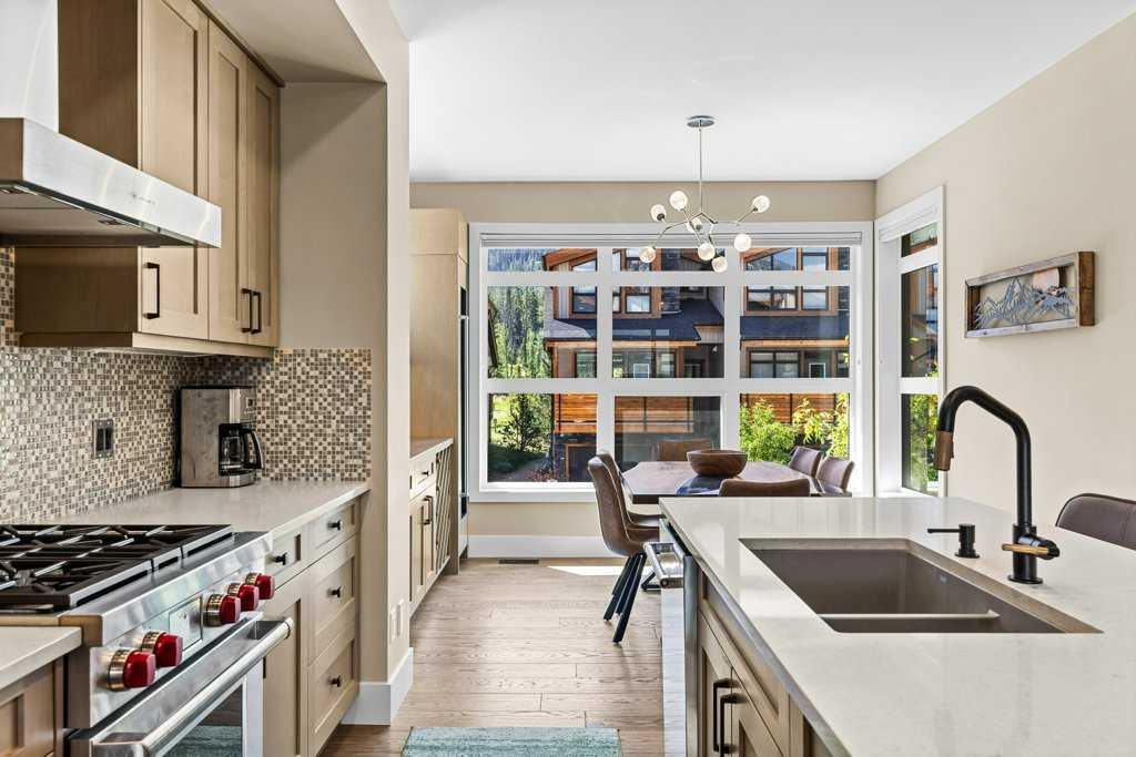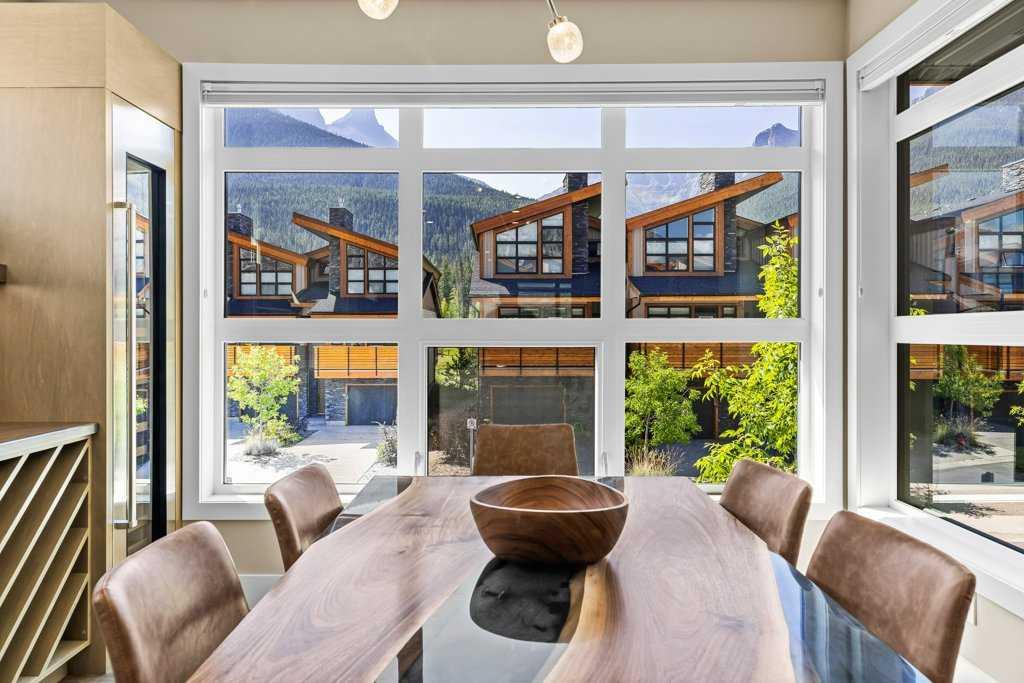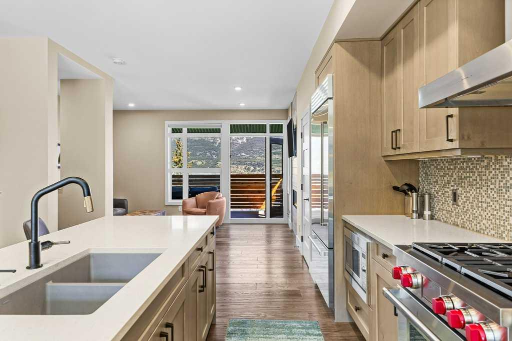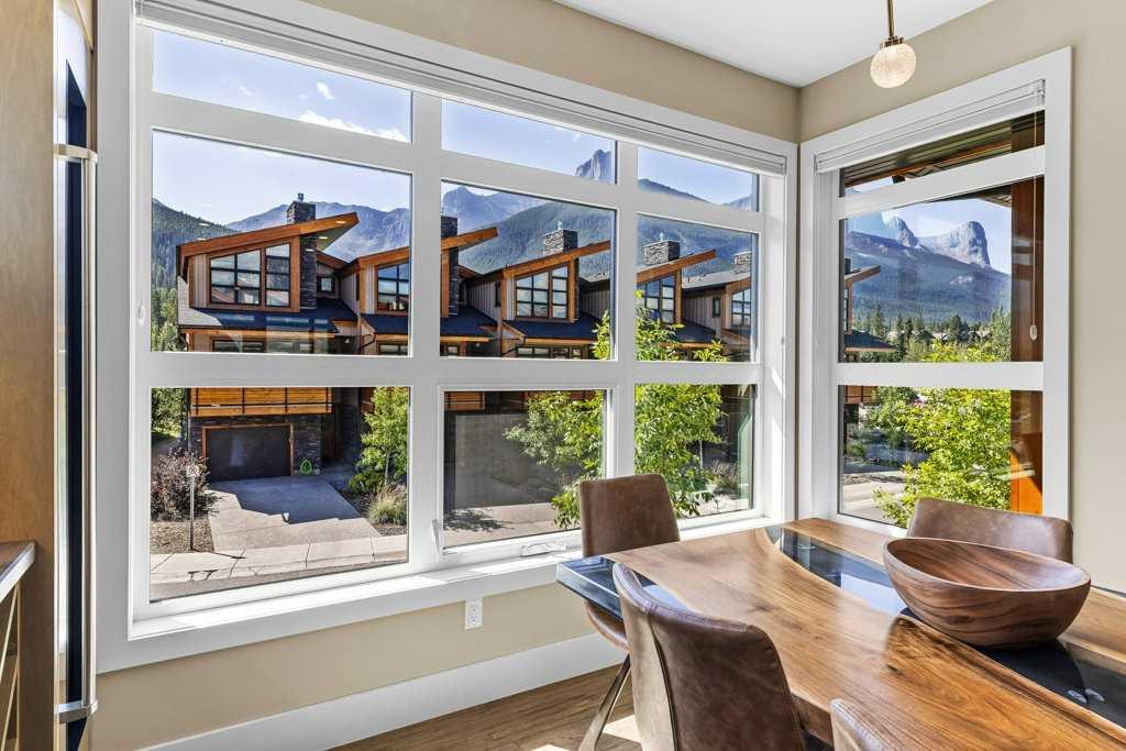 A meticulously designed end-unit townhouse in the heart of Canmore’s sought-after Three Sisters community. Step into the renovated kitchen, where quartz countertops, upgraded appliances to Wolf and SubZero, a spacious seating area, and a built-in full height SubZero wine fridge set the stage for both everyday living and elegant entertaining. The open-concept layout flows seamlessly into the living and dining areas, anchored by a warm gas fireplace and bathed in natural light from expansive windows. From here, step out onto your private deck to soak in the peaceful mountain air and views. Upstairs, you’ll find two spacious bedrooms, including a luxurious primary suite with ensuite bath, as well as a second full bathroom. This 2-bedroom, 3-bathroom mountain retreat offers approx 1500sqft of refined living space with unobstructed views of the three sisters, including a cozy office den perfect for working from home and a large separate gear room separated from an oversized single car garage plus extra driveway parking. The recently added air conditioning ensures year-round comfort.