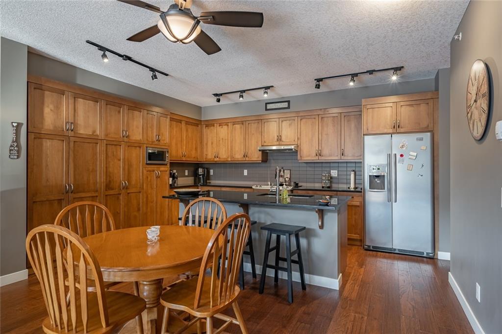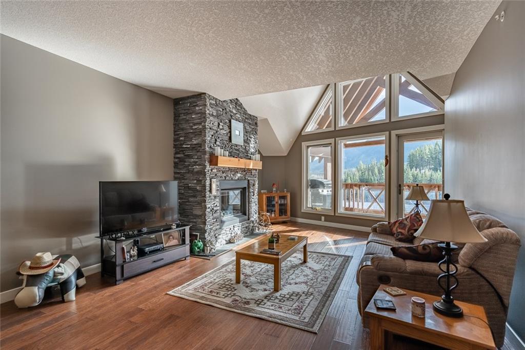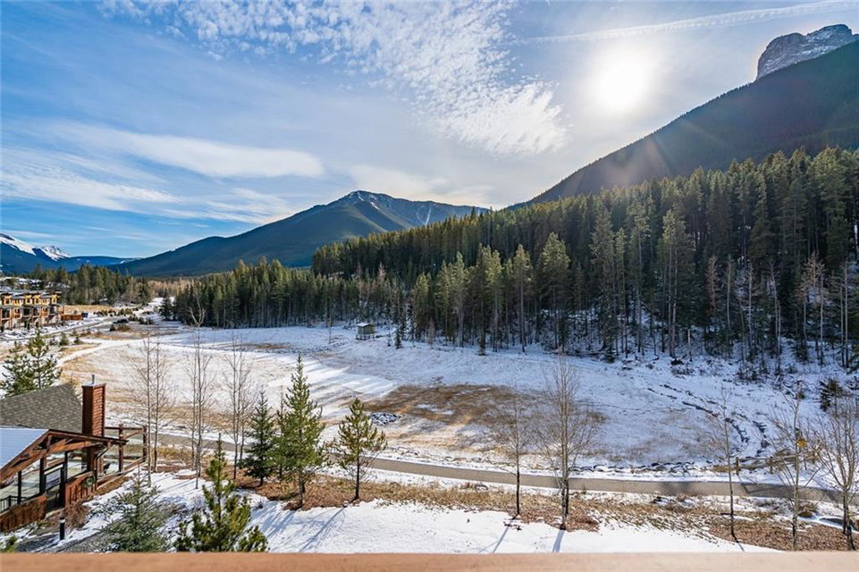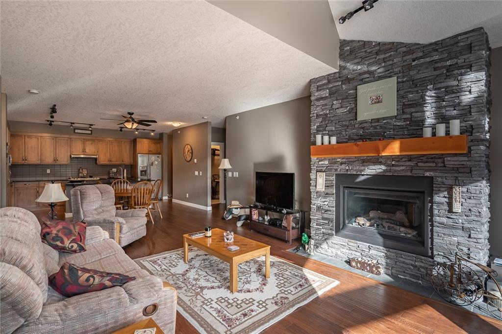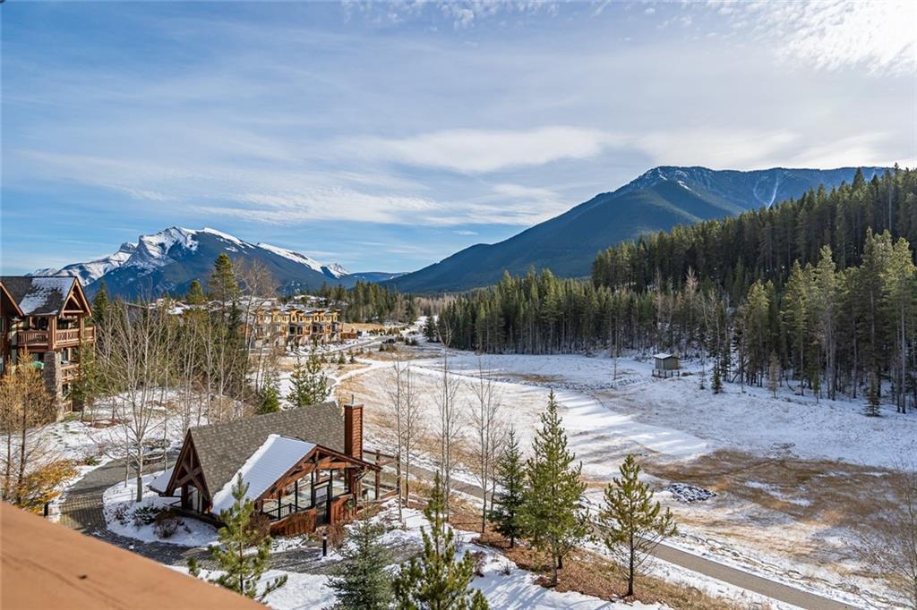 Beautiful penthouse with southeast exposure showcasing mountain views nestled on the top floor of Serenity Ridge! This stunning 2 bedroom, 2 bathroom home offers one level living with luxurious features & a gorgeous, vaulted, covered balcony offering spectacular views & peaceful perch to enjoy the scenery. Discover a gourmet kitchen, ample cabinetry, generous island, impressive living & dining space featuring a stone, gas fireplace, vaulted ceiling & large windows that capture the views. Retreat to a grand master bedroom with ensuite that includes a separate shower, large soaker tub & spacious walk through closet. A second bedroom, full bathroom, in suite laundry & storage as well as beautiful woodwork, granite, engineered hardwood & in floor heating throughout, complete this home. 2 underground, tandem parking stalls & storage unit included. Enjoy the outdoor hot tub, fire pit area & lounge amenities room that Serenity Ridge offers & the trails, golf course, recreation fields & bistro nearby!