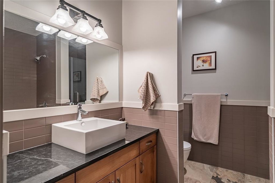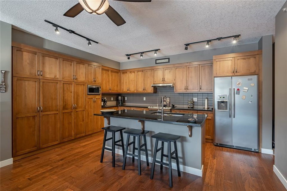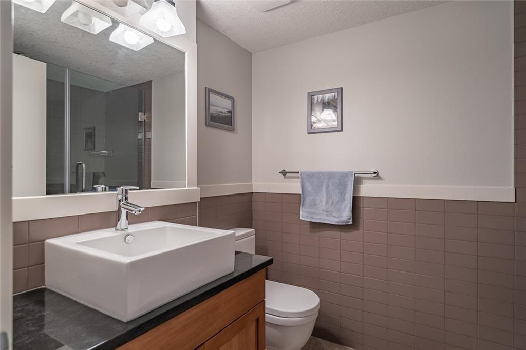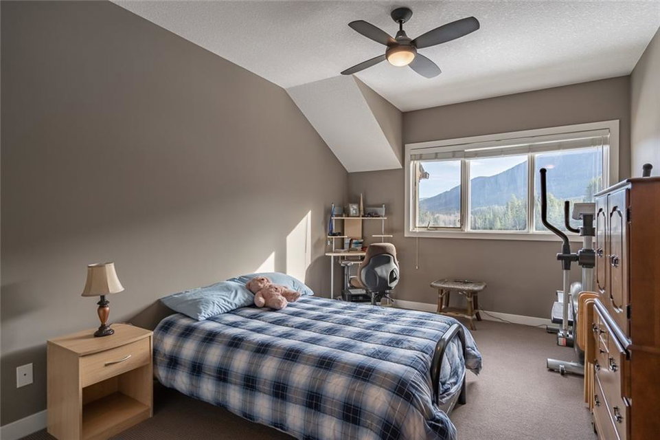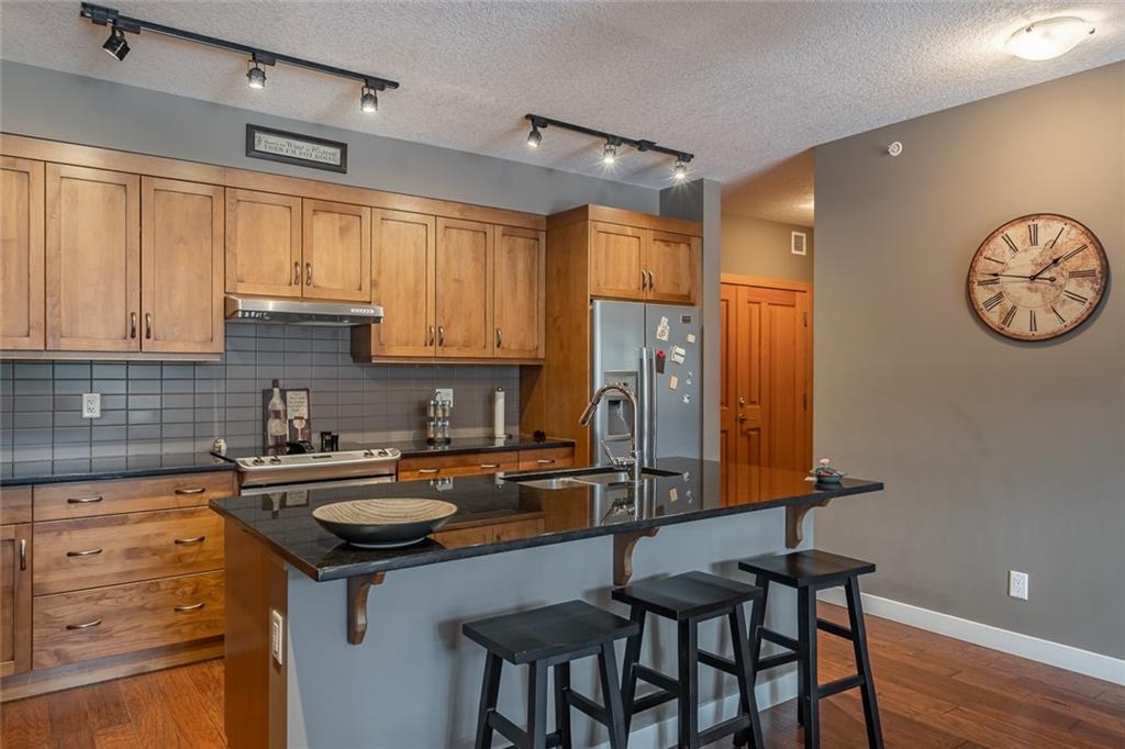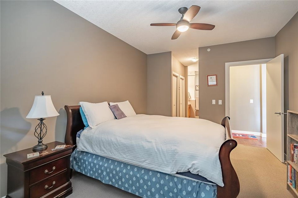 Beautiful penthouse with southeast exposure showcasing mountain views nestled on the top floor of Serenity Ridge! This stunning 2 bedroom, 2 bathroom home offers one level living with luxurious features & a gorgeous, vaulted, covered balcony offering spectacular views & peaceful perch to enjoy the scenery. Discover a gourmet kitchen, ample cabinetry, generous island, impressive living & dining space featuring a stone, gas fireplace, vaulted ceiling & large windows that capture the views. Retreat to a grand master bedroom with ensuite that includes a separate shower, large soaker tub & spacious walk through closet. A second bedroom, full bathroom, in suite laundry & storage as well as beautiful woodwork, granite, engineered hardwood & in floor heating throughout, complete this home. 2 underground, tandem parking stalls & storage unit included. Enjoy the outdoor hot tub, fire pit area & lounge amenities room that Serenity Ridge offers & the trails, golf course, recreation fields & bistro nearby!