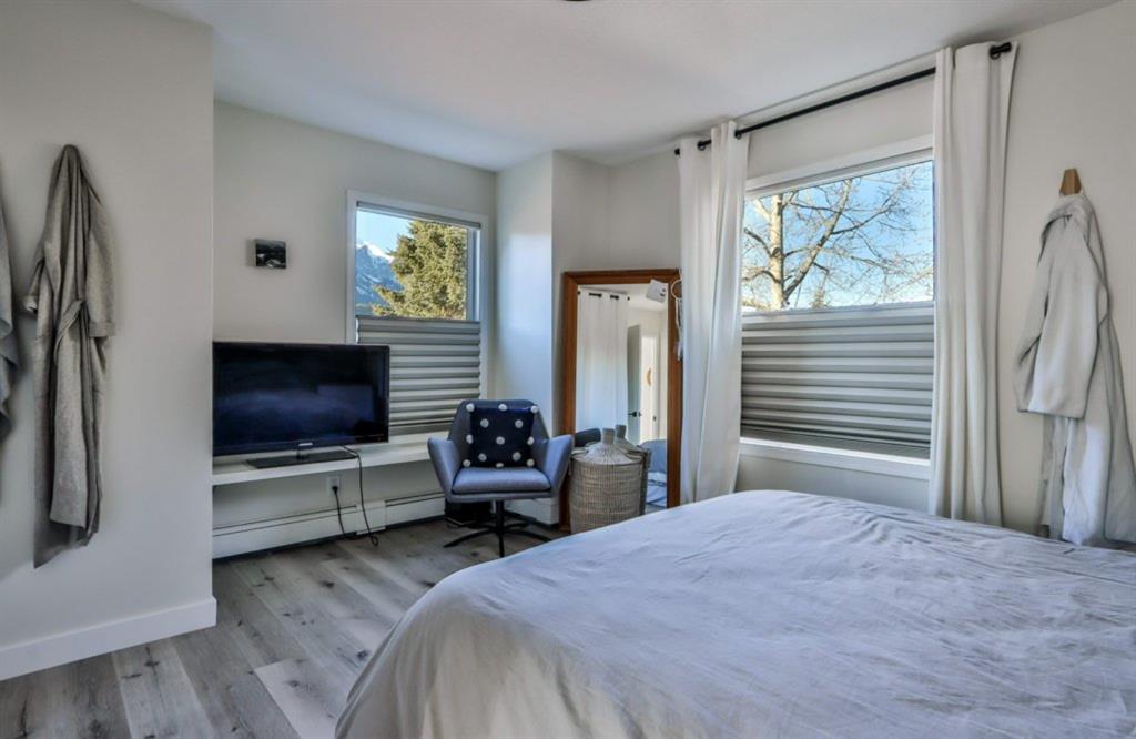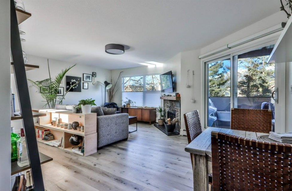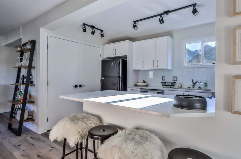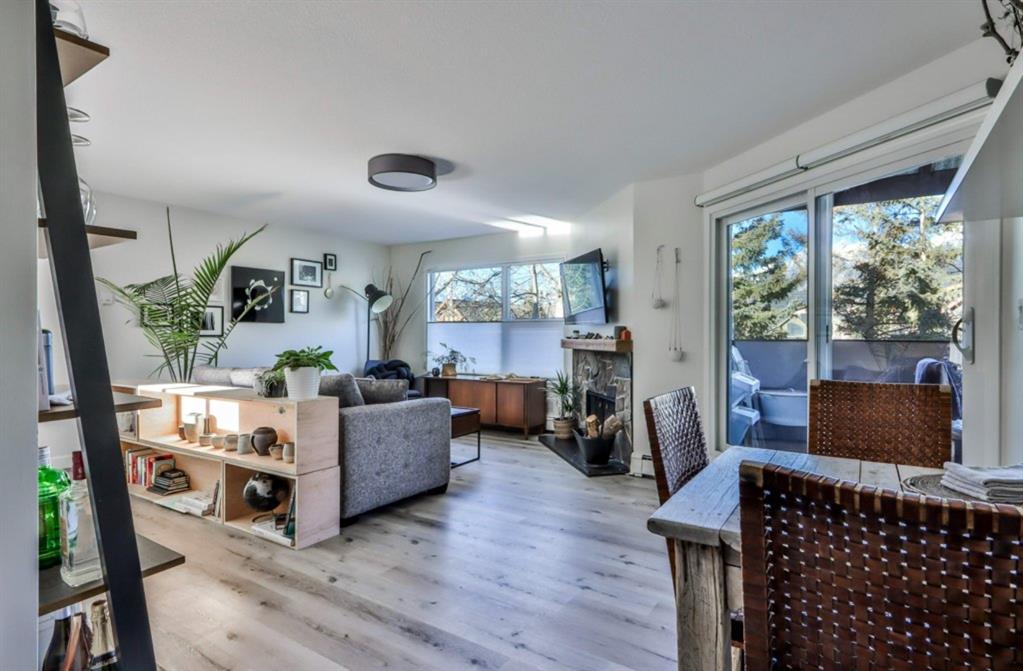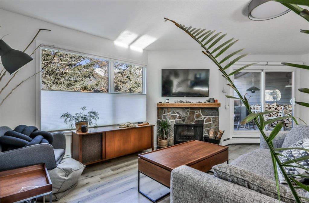 Beautiful, professionally renovated, top floor condominium steps from downtown & numerous amenities boasting views & one level living! Upon entering this stunning abode, discover an open & spacious living area featuring large windows that showcase the mountain & treed views with a wood-burning fireplace that adds a rustic & inviting element to the space. Find a dining area, kitchen featuring quartz countertops, island eating bar & bright window above the sink to enjoy the sunny, scenic views, in suite laundry, as well as sliding door access to a private, covered balcony also offering mountain views. Two bedrooms, den, & bathroom are tucked down the hall, each with mountain views, including a generous yet intimate master suite providing corner window views. Call this gorgeous, walkable, south Canmore home yours today!